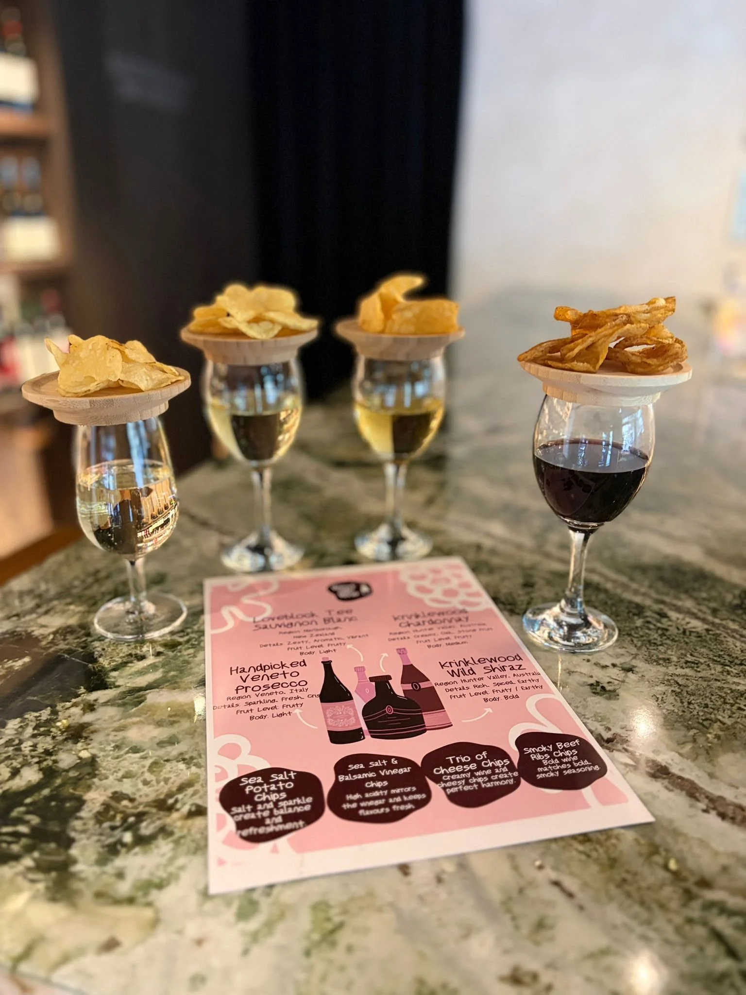 Enjoy 4 wines × 60ml paired with 4 chip selections for $30 per set.